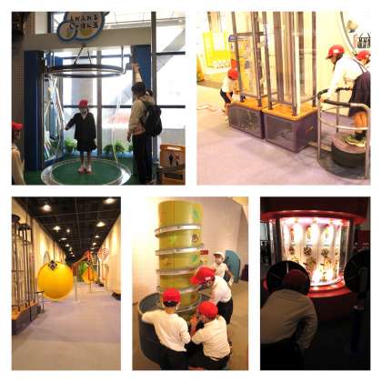 上のフロアには、科学遊びのコーナーがあります。大きなシャボン玉の中に入ったり、水や空気の力を体験したり、科学に関心を持つことができる遊びがたくさんあります。いつもは行列ができる各コーナーですが、今日はすぐに順番が回ってきます。