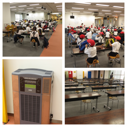 入れ替えの度に、係員の方が掃除と消毒作業を行ってくださってます。食事スペースには、業務用の空気清浄機も導入されていました。