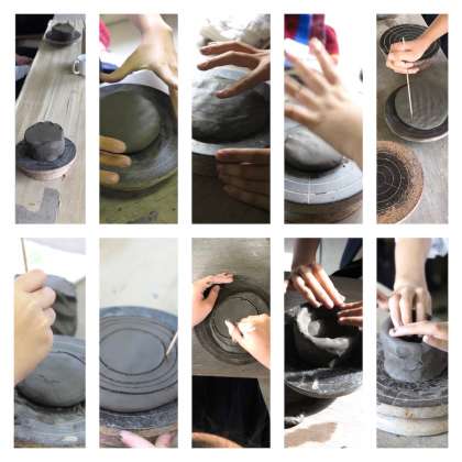 底が完成すれば、紐状に伸ばした粘土を積み上げていきます。全員、とても静かに集中して取り組んでいます。スタッフの方の説明をよく聞いて丁寧に取り組んでおり、力作揃いです。