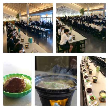 関ドライブインに到着。昼食は、豚鍋とハンバーグです。感染症対策ということで、全員が同じ方向を向いて食べます。