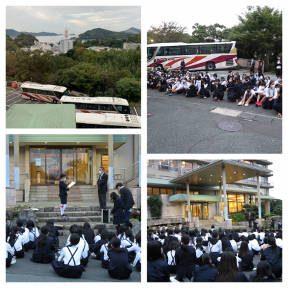 避難訓練の後、開舎式を行いました。全員で扇芳閣の方にご挨拶をしました。扇芳閣の皆さんは、毎年職員総出でお迎えとお見送りをしてくださいます。本校のために全館貸し切りにしてくださっており、セキュリティ面でも安心です。