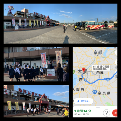 上野ドライブインでのトイレ休憩を終え、大阪に向かいます。到着予定時刻は17:00ですが、5〜10分ほど遅れるかもしれません。お迎えを予定されてる方は、この後配信するホームページの記事をご確認ください。
