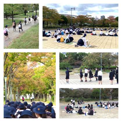 桜宮公園に全クラスが集まり、お弁当を食べます。お弁当を食べたクラスは、長縄で遊んでいます。