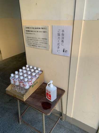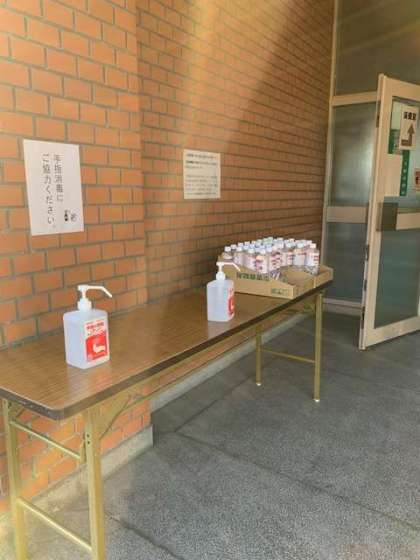 玄関や教室入り口には、アルコール消毒を置いています。来られた際は消毒をお願いいたします。