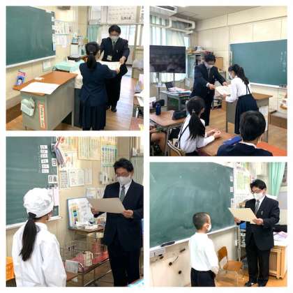 分校は放送室での表彰の様子を分校内に映像で配信しましたが、本校は映像配信ができないため、放送でお知らせしたあと、各学級に表彰に行きました。