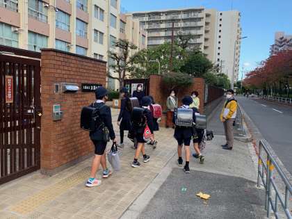 今朝の登校時は、地域の更生保護女性会の方が登校見守りに立ってくださいました。