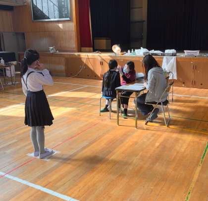 歯科検診時はマスクを外すため、ソーシャルディスタンスを保って順番待ちをしています。検診で要治療項目が見つかったときは、早めのケアが大切です。学校から【要治療】のお知らせがあったときは、医療機関の受診をお願いします。