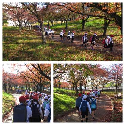 3年生の校外活動は延期になりましたが、今日は紅葉がとても綺麗です。見事に色づいた桜並木の中を抜けて、大川・淀川河川敷に向かいます。