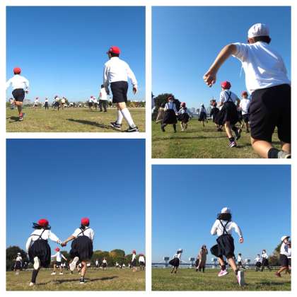 淀川河川公園で、クラスごとにいろいろな遊びを楽しんでいます。だるまさんが転んだ、おにごっこなど、みんな元気よく遊んでいます。