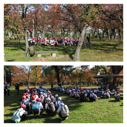 城北公園に到着しました。これからお弁当とおやつを食べます。 とても暖かく、ただいま気温24度です。