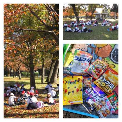 お弁当を食べ、早いグループはおやつを食べ始めています。子どもたちに話を聞くと、朝早くからお弁当のご準備をしてくださった様子が伝わってきます。一度延期になったのでお弁当を2回ご準備いただきましたが、手の込んだお弁当、子どもたちの大好きなものがいっぱい入ったお弁当、子どもたちはとても喜んでいました。ありがとうございます。
