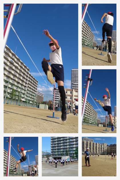都島区の体力向上事業により、各学校に体育の指導者の派遣をしていただいています。今日の出前授業は5年生の体育。走り幅跳びにチャレンジです。
