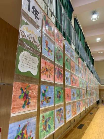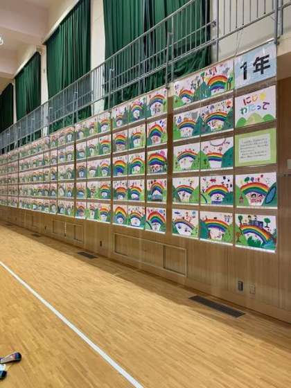 1年生は、「にじをわたって」と「おしゃれな きょうりゅう」のテーマで絵を描きました。