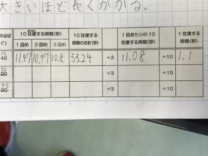 子どもたちは各グループに分かれて、10回往復する時間を記録し、その結果からめあてに関する考察を行います。