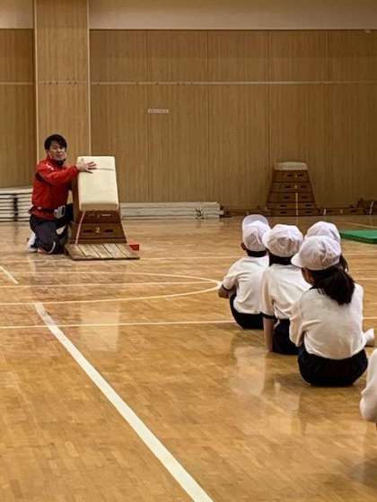 本日も講師先生に来ていただき、2年生に「跳び箱運動」を指導してくださっています。