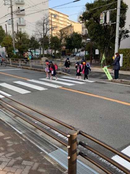 この他のポイントにも、PTAの交通立番の方や地域のボランティアの方が立ってくださっています。子どもたちが安心して登校できるのも本当に皆さんのおかげだとつくづく感じます。