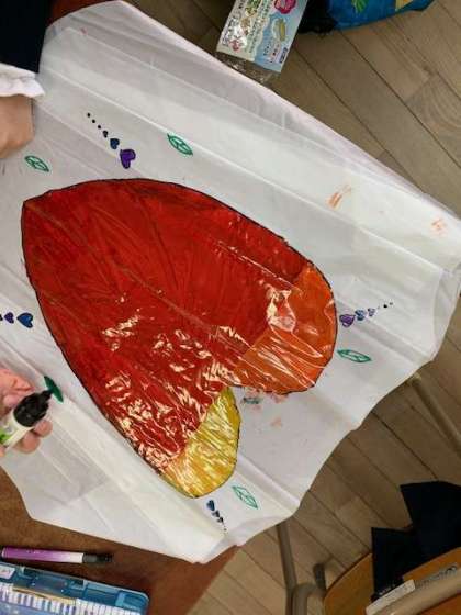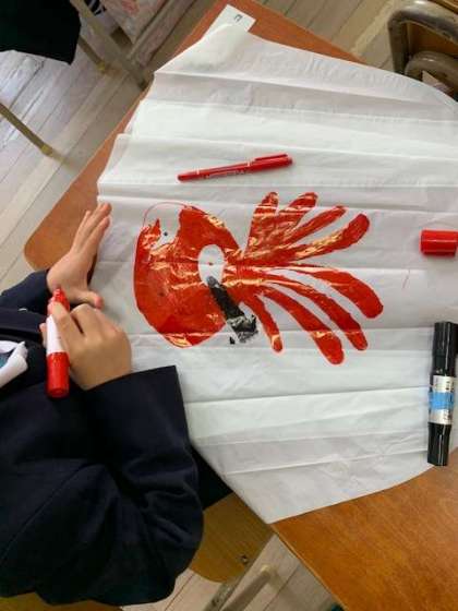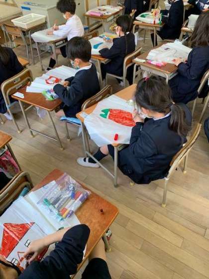 一年生では、凧に自分の好きな絵を描いて、空にあげようとそれぞれに作品づくりに取り組んでいます。「凧に蛸、おもしろいでしょ。」とある子どもが話をしてくれました。