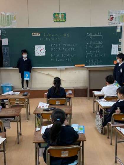 「お休みの一日を発表しよう」とめあてに、黒板にあるアナログ時計の時間を合わせて一人ひとり発表します。