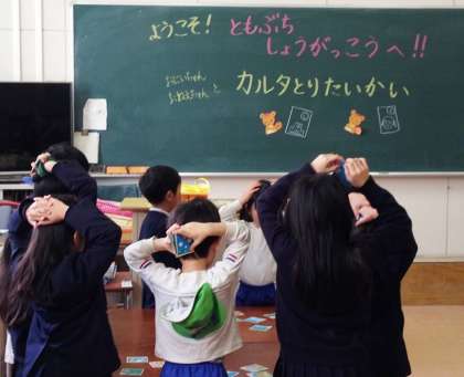 2時間目、4月から1年生となる友渕保育園の年長組の幼児約70名が分校に来て、1年生の教室にてカルタ大会をしながら楽しく交流しました。