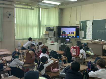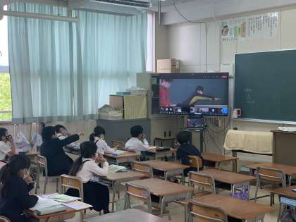 教室にいる子どもたちは先生のお話を聞き、集中してビデオ会議を見ていました。