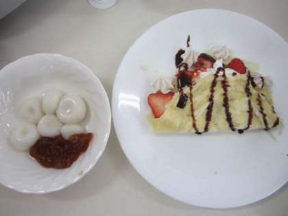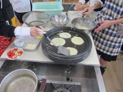 出来た「ミニクレープ」にイチゴ・バナナなどをのせ、その上に生クリームを使ってきれいに飾っていました。とてもおいしそうに出来上がり、さっそくグループで試食していました。