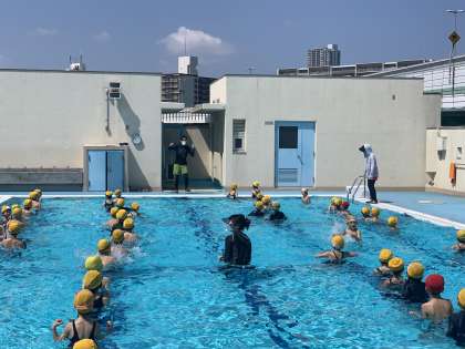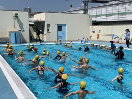 先生の動きに合わせて、顔を水につけたり、浮いたり、水をかけあったりして楽しそうに水慣れの活動をしていました。