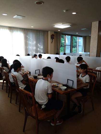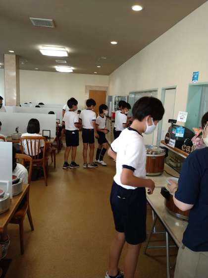 みやま荘の朝食風景です。おかわりに並ぶ子たくさんいて、みんな元気に過ごしています。