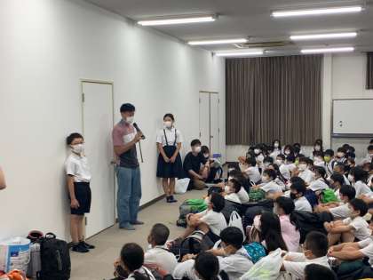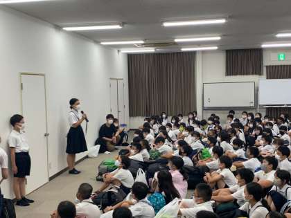カートンドッグの後、突然の雨になりましたので、閉舎式はみやま荘の大ホールで行いました。