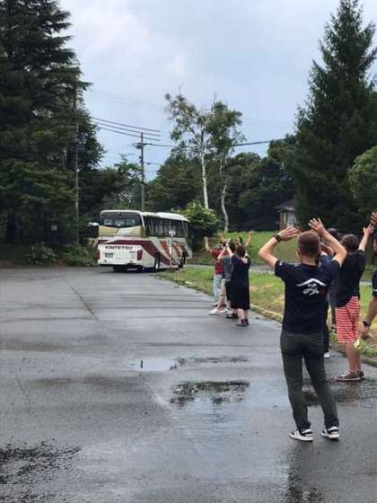 バスに乗り込むときには雨も止み、元気に大阪に向かいました。