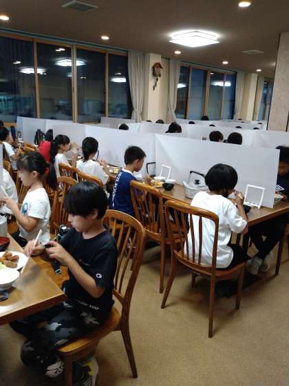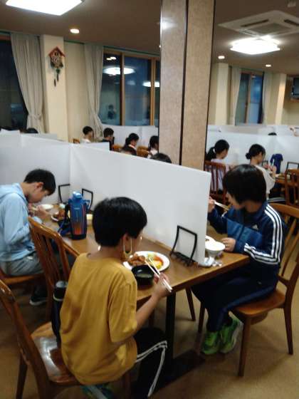 みやま荘の夕食の風景です。感染防止の仕切りはありますが、友だちとの食事は格別のようです。