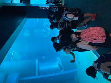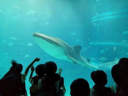 大水槽では、主役のジンベエザメやシュモクザメが優雅に泳ぐ姿に熱心に見入っていました。