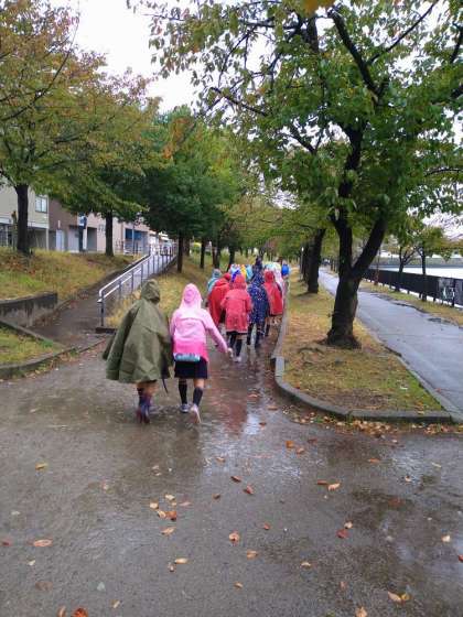 雨天の中ではありますが、元気に出発しました。桜ノ宮駅でもマナーに気をつけながら電車を待っています。