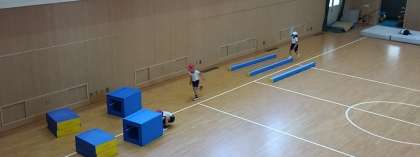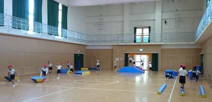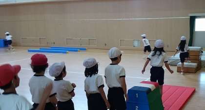 今日は、2年生が体育館にコースを作ってサーキット的に活用していました。このブロックマットは発砲ウレタン製なので、とても軽く、子どもたちでも移動が可能なので、手分けして準備することができます。また、跳び箱もウレタン製なので、体に当たっても痛くなかったり、マットは裏に滑り止めがついていて子どもたちの激しい動きにもピクリとも動かなかったり、かなり優れものです。