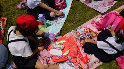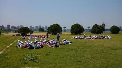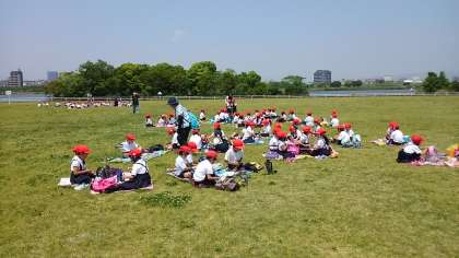 淀川河川敷の芝生の上でおいしそうに友だちと一緒にお弁当を食べています。