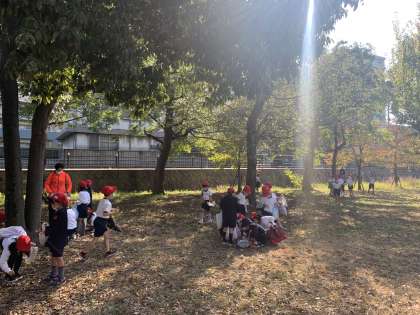 色づいている葉っぱやドングリを見つけて「先生、みつけたよ」とうれしそうに教えてくれる姿が印象的でした。