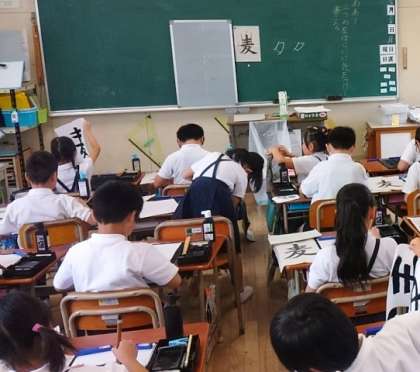 2時間目 4年生では毛筆書写の学習をしている学級がありました。ちょうど1年前の今頃、毛筆書写の学習を始め、「一」を一生懸命に書いていた子どもたち。それが、今日は“左はらい”が2つある「麦」という字の練習をしていました。1年間でずいぶんとできるようになったなあと 改めて感じました。