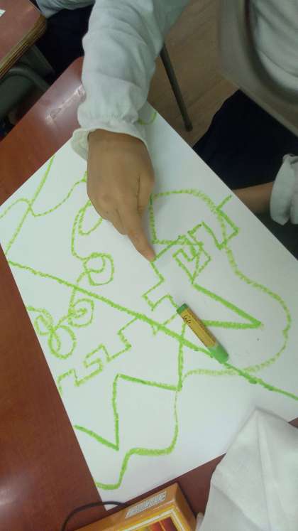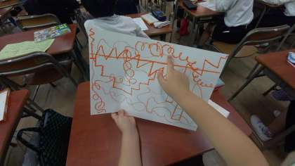 ぽきぽきの線、てんてんの線、なみなみの線、まっすぐな線、ぎざぎざの線、くるくるの線など、パスを使って、いろいろな線を描いています。