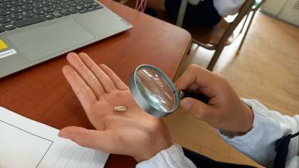 手のひらにのせた種を虫メガネで、じっくり観察しています。