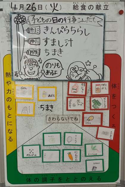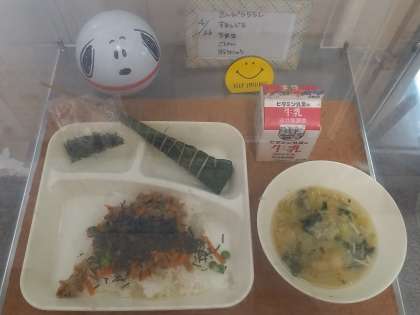 今日は、こどもの日の行事献立『きんぴらちらし、すまし汁、ちまき、牛乳』でした。