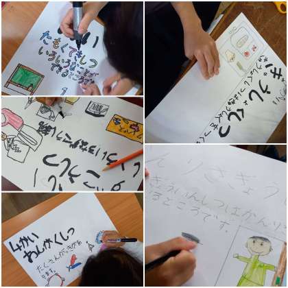 生活科の学習です。学校内にある特別教室等の紹介を絵や文でわかりやすくかいています。