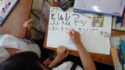 1年生に分校のことを紹介するために、画用紙に絵や文を書いています。