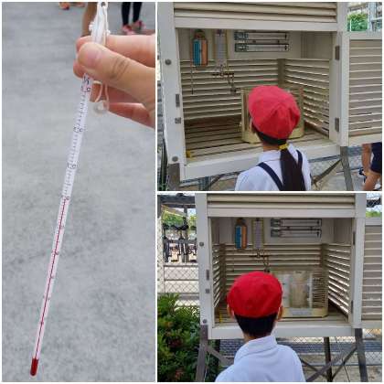 棒温度計を使って気温を計ったり、百葉箱の中を見たりしています。