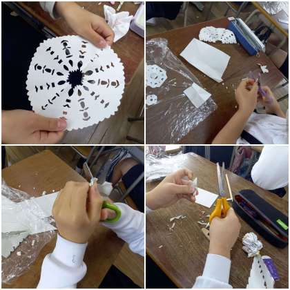 紙を重ねて折り、ハサミで模様を作っています。