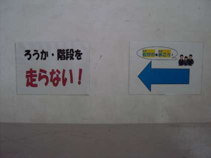 廊下・階段は走らず、右側通行で! 子どもに呼びかけています。