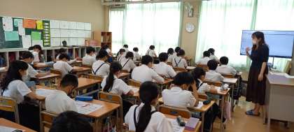 リスニングテストに取り組んだり、先生の発音を真似て繰り返し英単語を発音したりしています。
