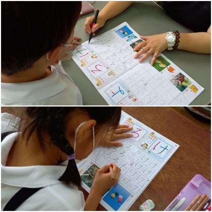 手本をよく見て、ゆっくりていねいに書いています。 先生に丸をつけてもらうと、思わずにっこり。