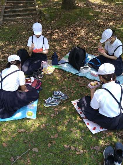 それぞれのグループにわかれて昼食をとっています。広い場所で友だちといただくお弁当は格別のようで、とても喜んでいます。