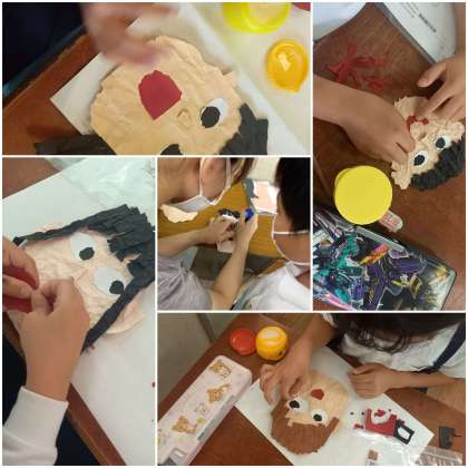 画用紙を使って、自分の顔を作っています。 どの顔もにっこり笑顔です。