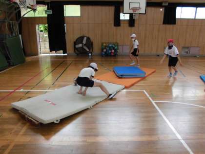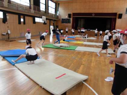今日は、開脚前転をしました。立ち上がる時の足の広げ方に気を付けながら、取り組んでいます。