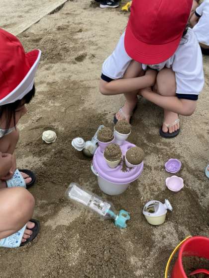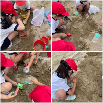 運動場の土や砂場の砂と水を使って、『泥んこ遊び』を楽しんでいます。